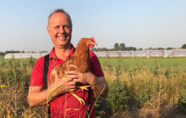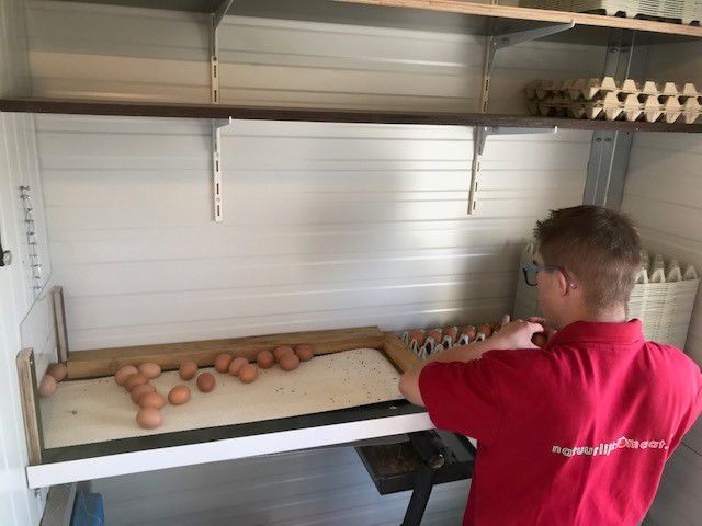 ’s Morgens, wanneer de kippen wakker worden, is het net als in een modern volièresysteem. Ze krijgen biologisch voer in een voergoot, drinken uit de drinknippellijn en het eitje wordt gelegd in een afsluitbaar wegrolnest. De geïsoleerde vloer in de caravan dient als scharrelruimte. Het hele systeem wordt aangestuurd door een stalcomputer. De computer draait op duurzame energie uit de 10 zonnepanelen op het dak van de caravan. De niet-gebruikte stroom wordt opgeslagen in accu’s. Het regenwater wordt via het dak opgevangen en hergebruikt als drinkwater voor de leghennen. Het grote voordeel van de kipcaravan is dat hij verplaatsbaar is. De caravan wordt regelmatig een aantal meter verplaatst. Als de kippen een stuk land kaal gepikt hebben, worden ze naar een ander perceel gebracht. Zo breng je de kippen naar het eten, in plaats van andersom. Dat maakt het duurzaam en bovendien is het mooi om de kippen in het open veld te zien scharrelen. Deze manier van biologische kippen houden maakt, samen met de enorme vrijheid die de dieren hebben, dat deze eieren het ‘normale’ scharrelei flink overtreffen: het is een biologisch scharrelei plus.