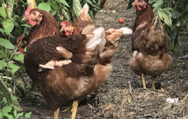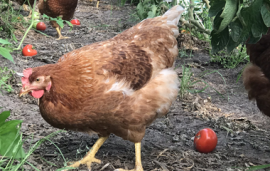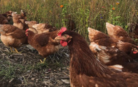 In de caravan houden we 244 leghennen en 5 hanen. De kippen leggen gemiddeld 300 bruine eieren per jaar. Het zijn hele vriendelijke, nieuwsgierige kippen die vrijwel alles eten. De hanen zijn er bij om de kippen te beschermen tegen roofvogels. Overdag scharrelen de kip­pen los in de wei en tussen de kerstbomen achter onze tuinbouwkas en ’s avonds gaan ze er weer op stok. De caravan heeft 2 uitloopluiken, deze worden ‘s avonds automatisch (tijdklok) gesloten.